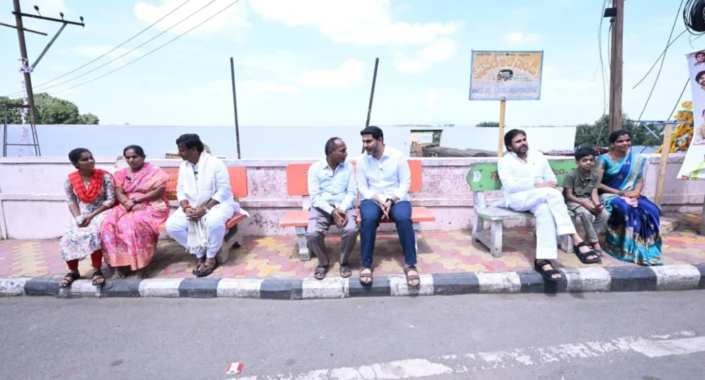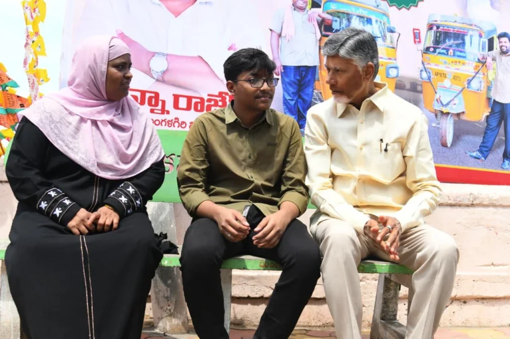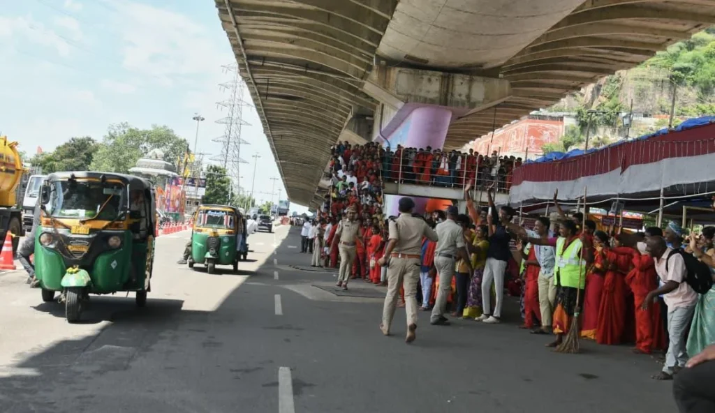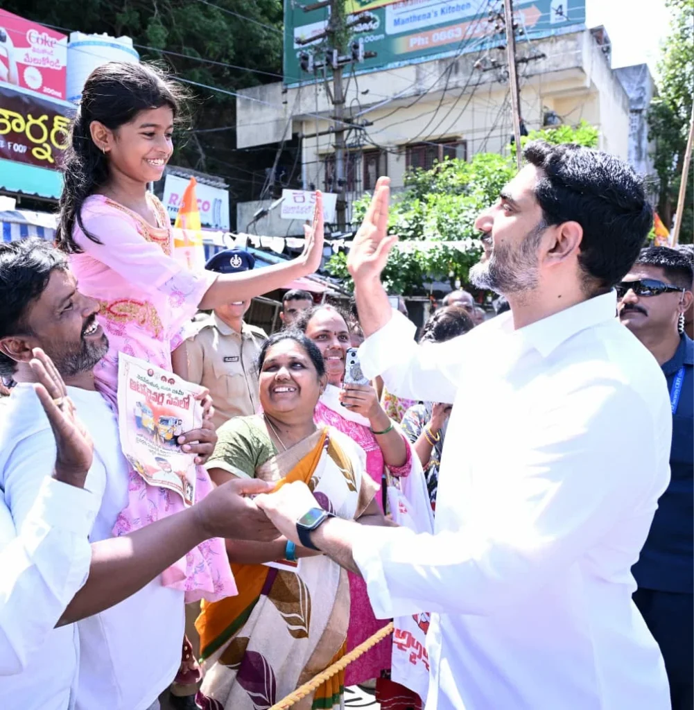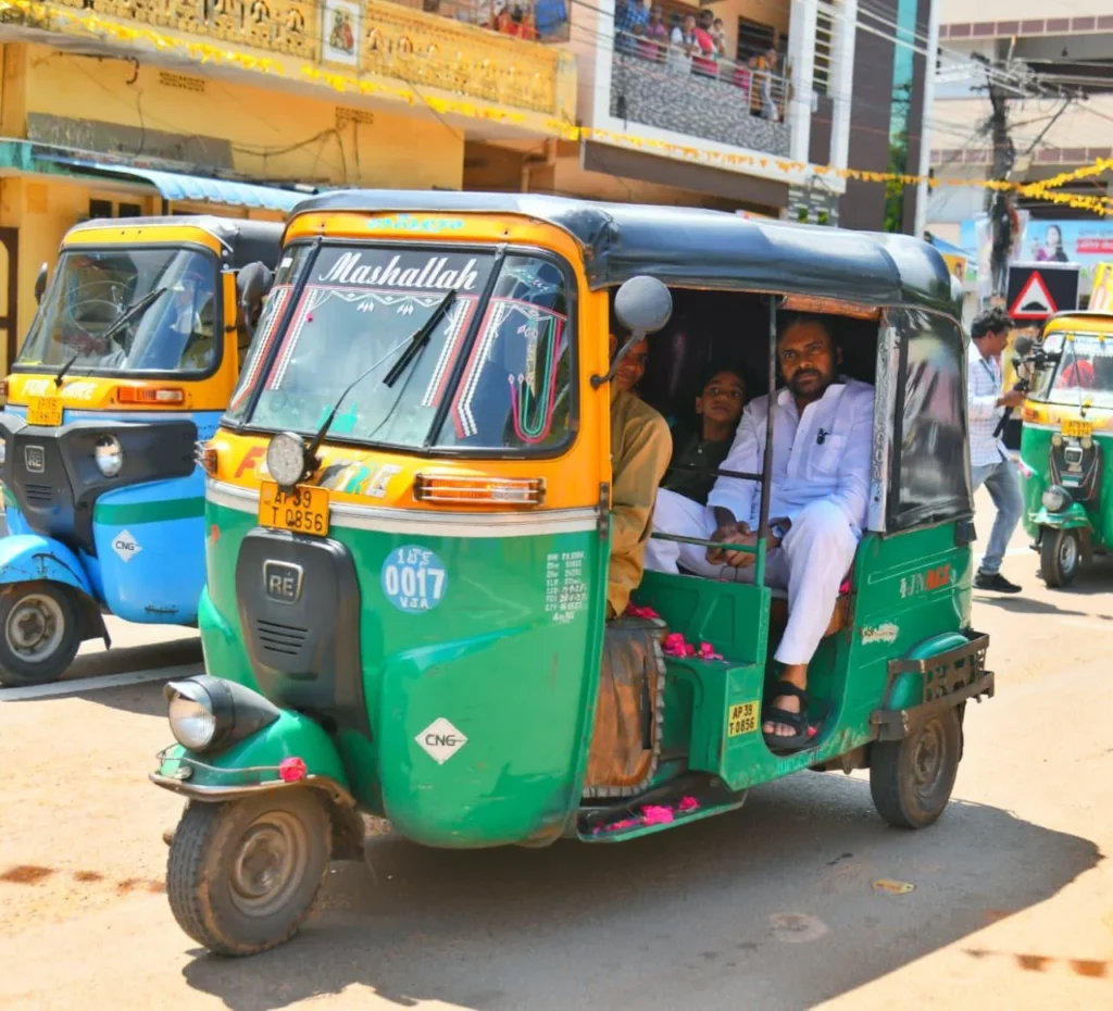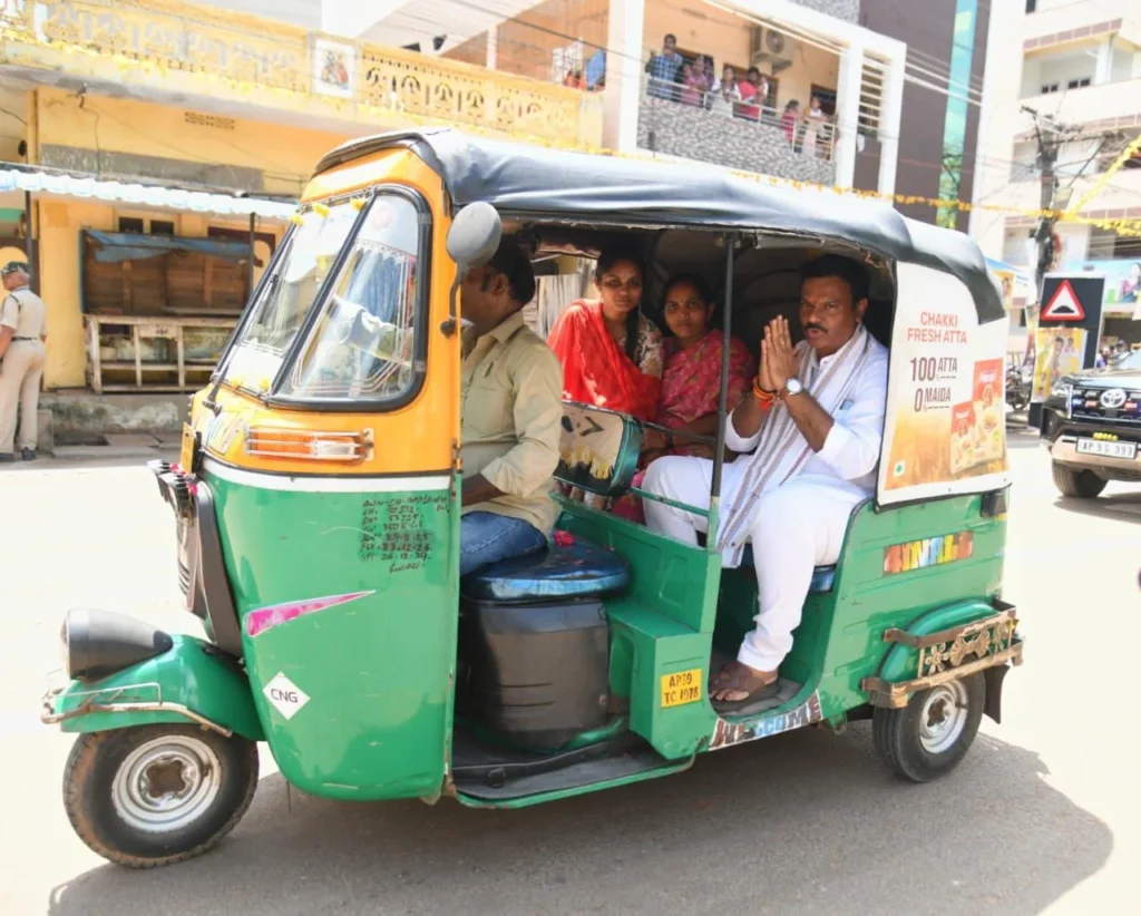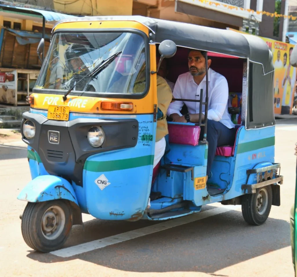 Along the way, thousands of people thronged the streets to greet the leaders. Before boarding the autos, Lokesh draped traditional Mangalagiri handloom shawls on the Chief Minister, Deputy Chief Minister, and Madhav. A woman auto driver also had the distinction of ferrying Lokesh to the venue.
