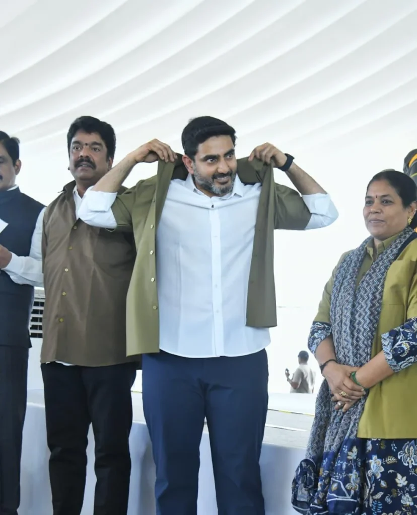 Enthusiastic beneficiaries and their families welcomed the leaders at the stadium. In a symbolic gesture, Naidu, Pawan Kalyan, Lokesh, and Madhav donned khaki shirts gifted by drivers. Two autos and a maxi cab were displayed on stage to represent the spirit of the initiative.