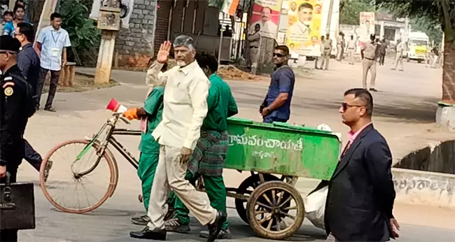 Later, Chandrababu Naidu walked through the village along with sanitation workers to personally inspect cleanliness efforts, underlining the government’s commitment to hygiene at all levels. Earlier, TDP leaders and ministers, including Speaker Ayyannapatrudu, Home Minister Anita and district in-charge minister Kollu Ravindra, accorded him a warm welcome at the helipad.
