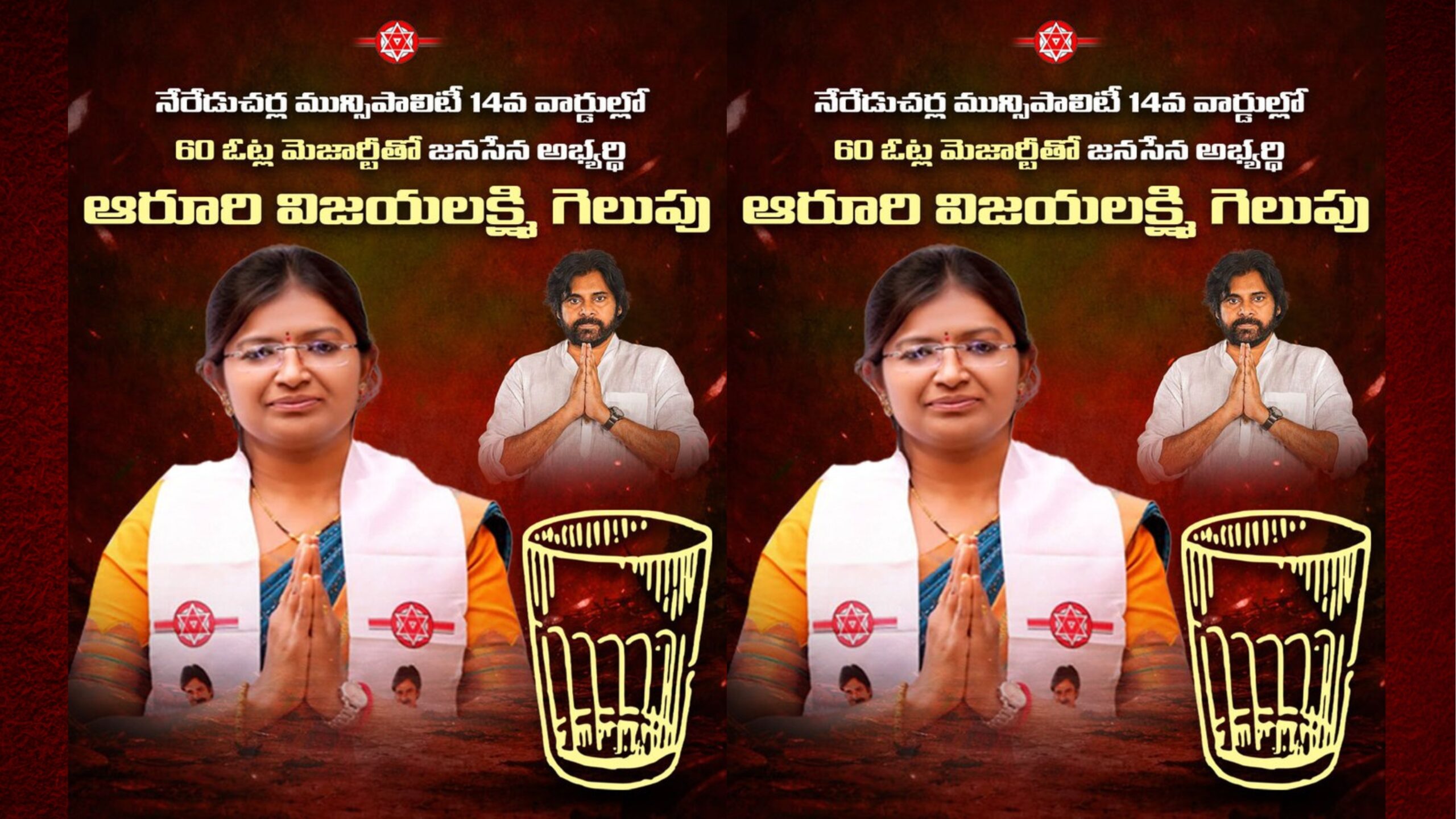 Smt. Aruri Vijayalakshmi secured victory from the 14th ward of Nereducharla Municipality in the erstwhile Nalgonda district. As a result, she became the first Jana Sena councillor in Telangana.