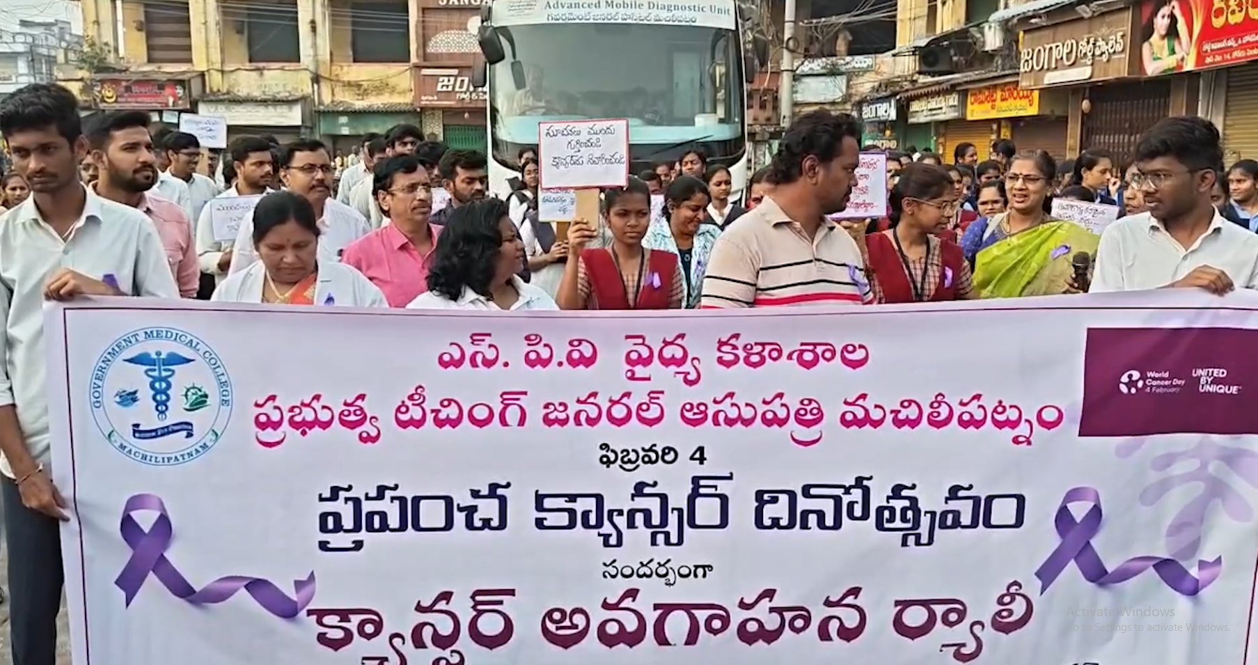 In Machilipatnam, Krishna district, medical students organised a large-scale awareness rally to mark World Cancer Day. The rally started at Koneru Centre and moved all the way to Bell Company, drawing the attention of residents along the route.