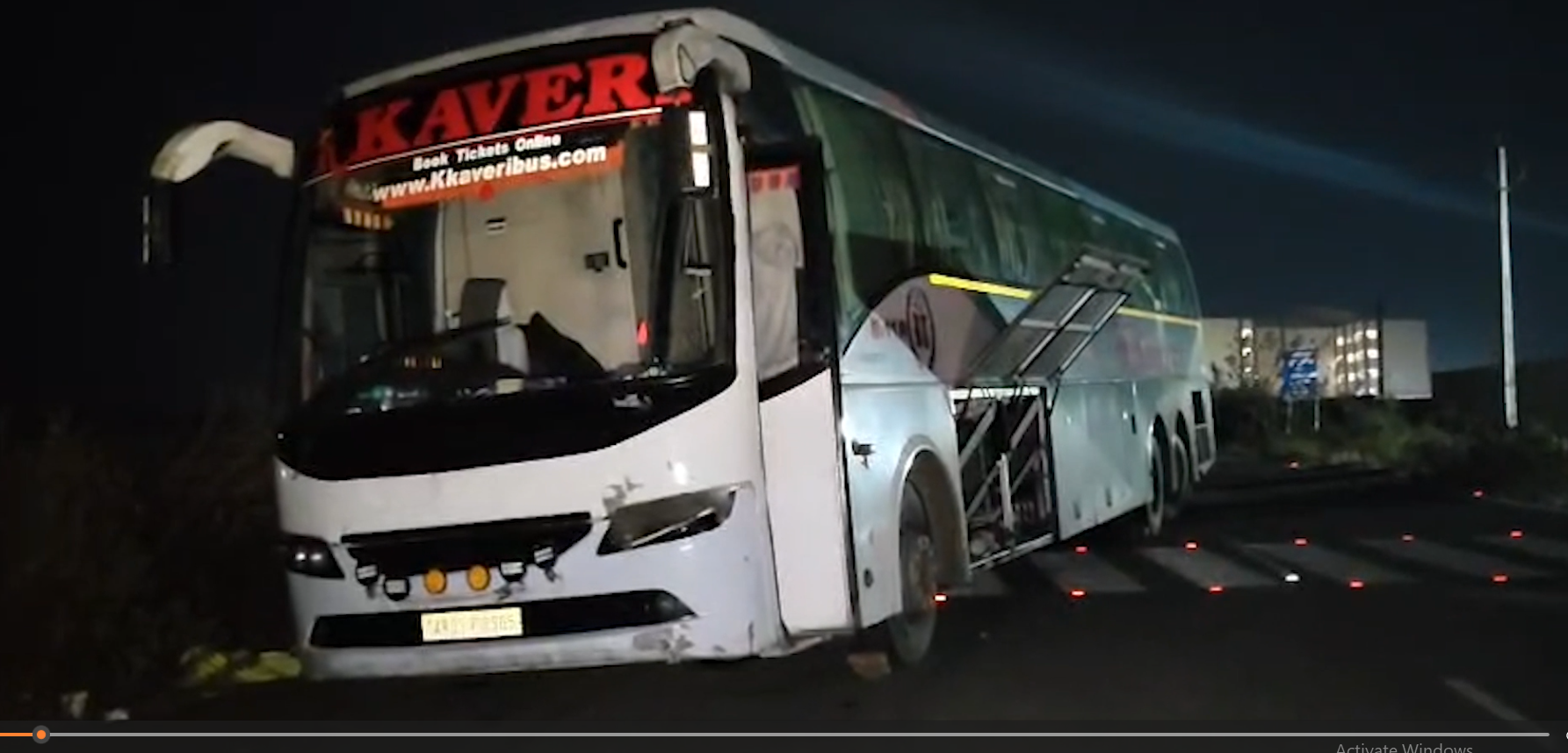 A major road accident was narrowly avoided in Andhra Pradesh after a Kaveri Private Travels bus lost control and rammed into a road divider on the outskirts of Kurnool early Tuesday morning. The incident occurred near the TIDCO House area while the bus was travelling from Puducherry to Hyderabad, triggering panic among passengers on board.