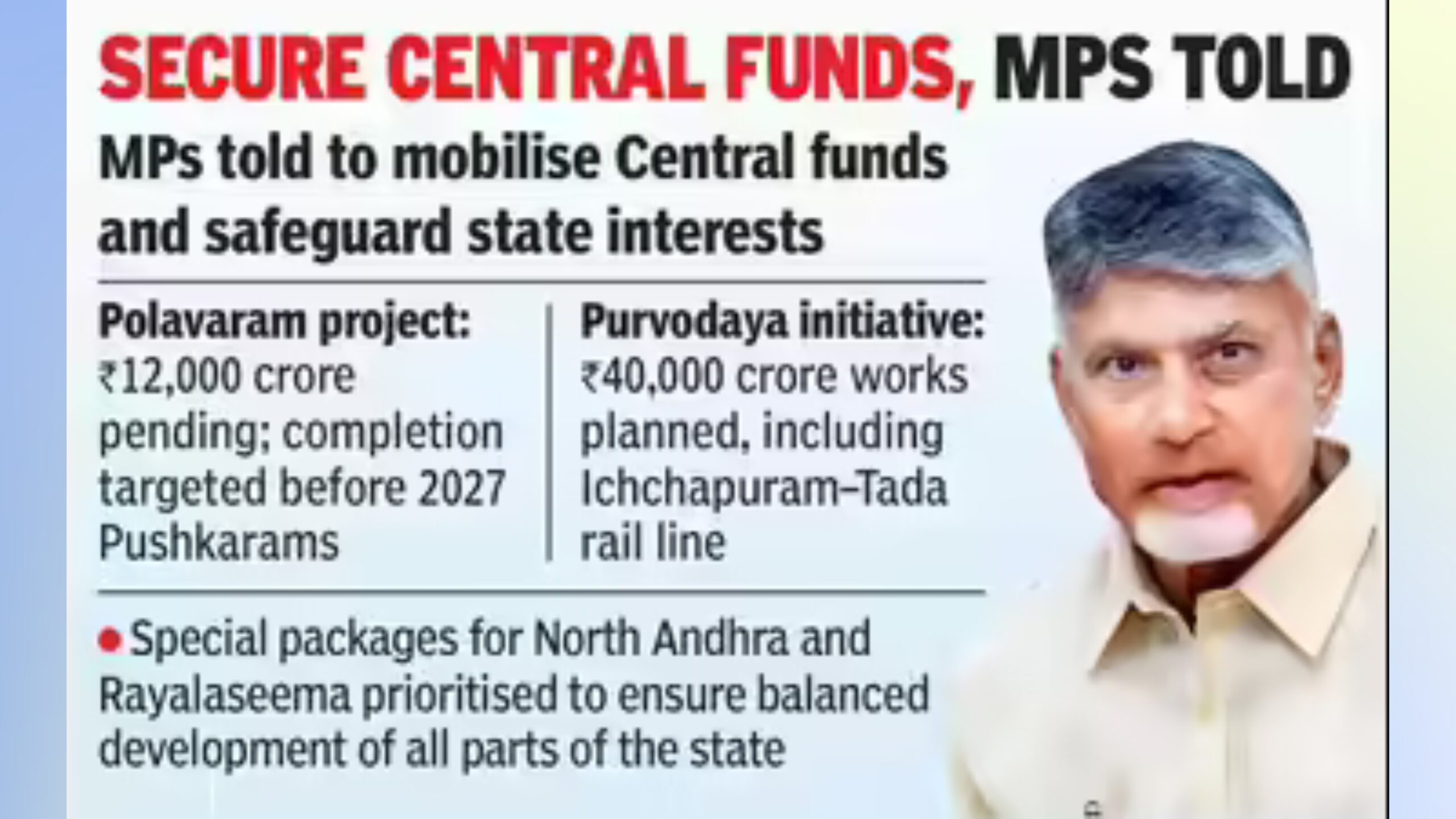 Meanwhile, Chandrababu Naidu directed TDP Members of Parliament to stay in constant touch with Union ministers and senior officials. He urged them to focus on securing maximum benefits for Andhra Pradesh. He asked MPs to continuously explore what more the state could achieve through central funding. In particular, he highlighted special packages for North Andhra and Rayalaseema as key demands. He also instructed MPs to raise irrigation projects under the Purvodaya scheme, with priority given to Polavaram and Nallamala Sagar.