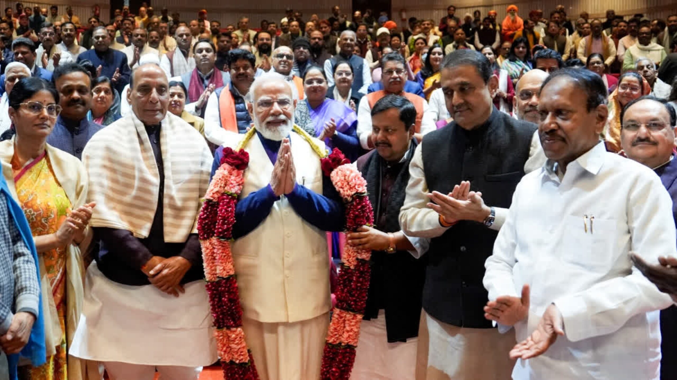 The NDA parliamentary party meeting began in New Delhi under the leadership of Prime Minister Narendra Modi. The session brought together MPs from the BJP, TDP, Jana Sena, JD(U), LJP(R), Shiv Sena, and JD(S). At the start, Prime Minister Modi and newly appointed BJP national president Nitin Nabin were felicitated by NDA lawmakers. The meeting focused on the Union Budget 2026, the “Vikasit Bharat @2047” vision, and the government’s legislative agenda in Parliament.