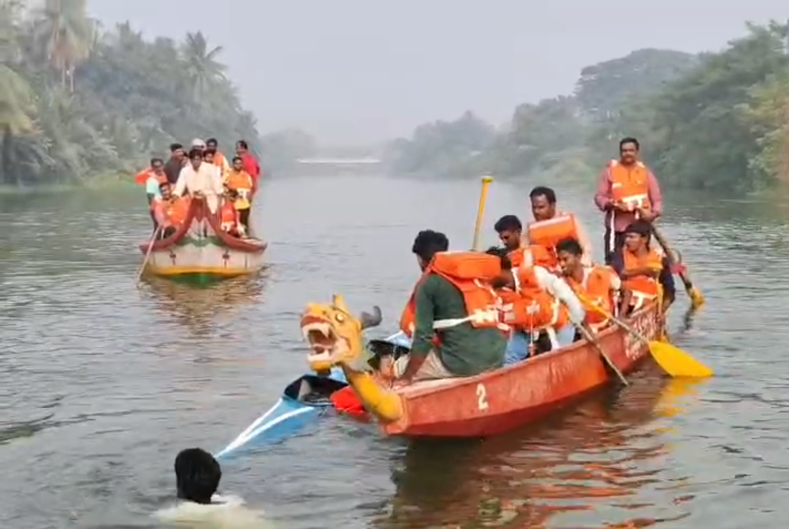 The Konaseema District Collector, Mahesh Kumar, had a narrow escape on Tuesday during a trial run for the Sankranti boat races. He personally inspected the event arrangements ahead of the festival.
