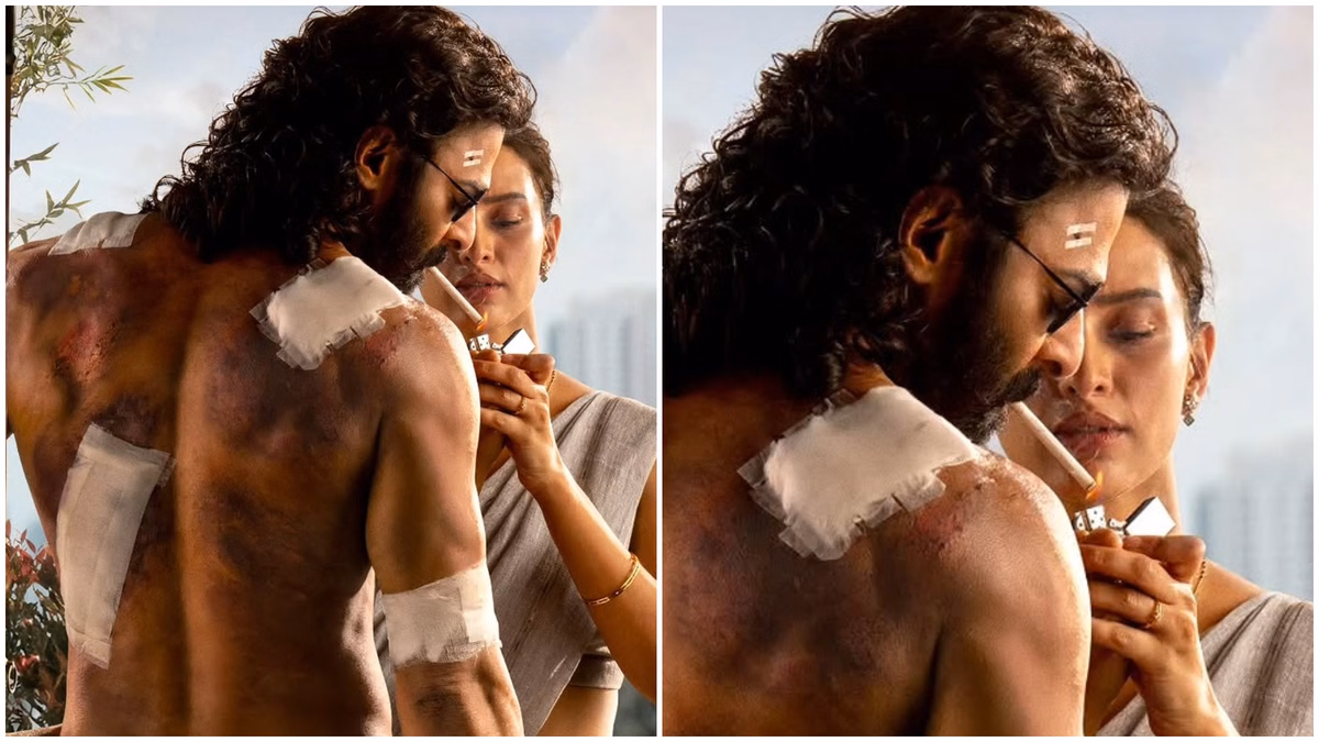 The poster presents a powerful and intense visual. Prabhas appears shirtless, standing near a window, with visible injuries across his body. He sports dark glasses and off-white pants, adding to his rugged and mass appeal. Beside him, actress Tripti Dimri is seen lighting a cigarette, which adds depth and intrigue to the frame. Overall, the poster hints at a raw, violent, and emotionally charged narrative.